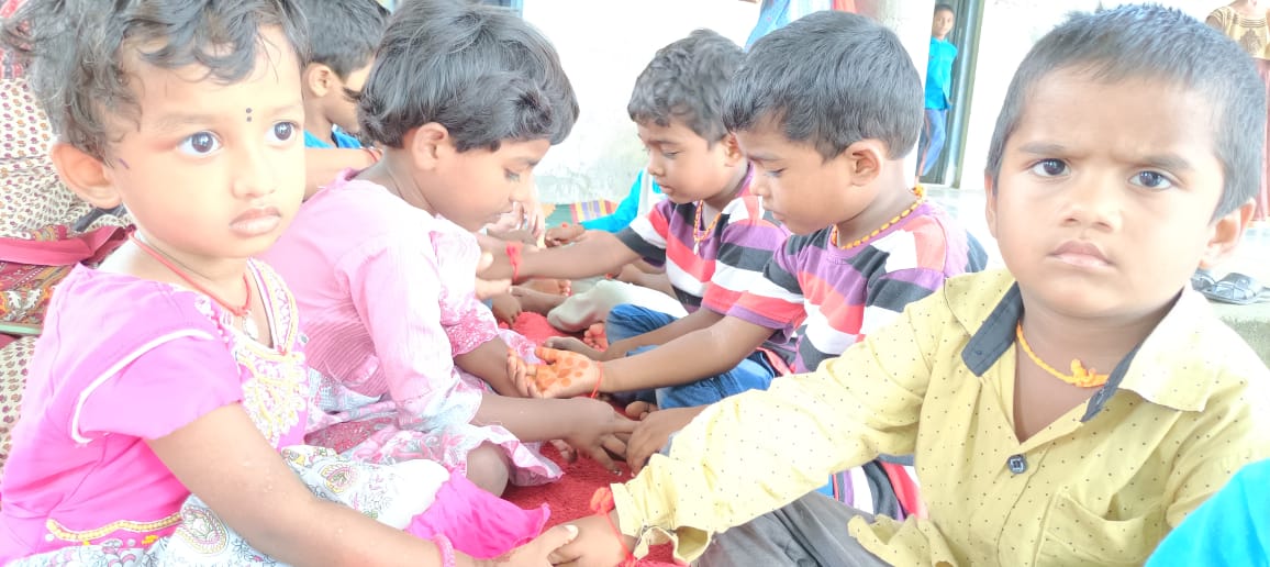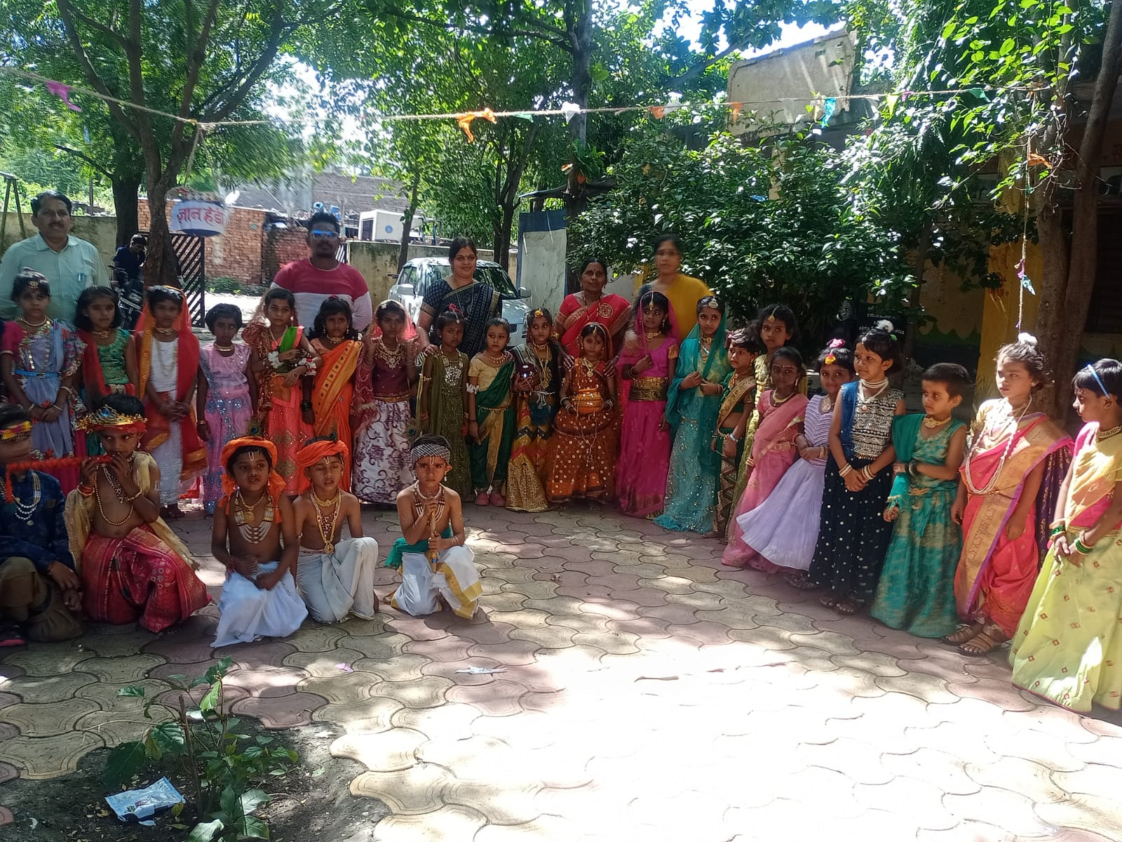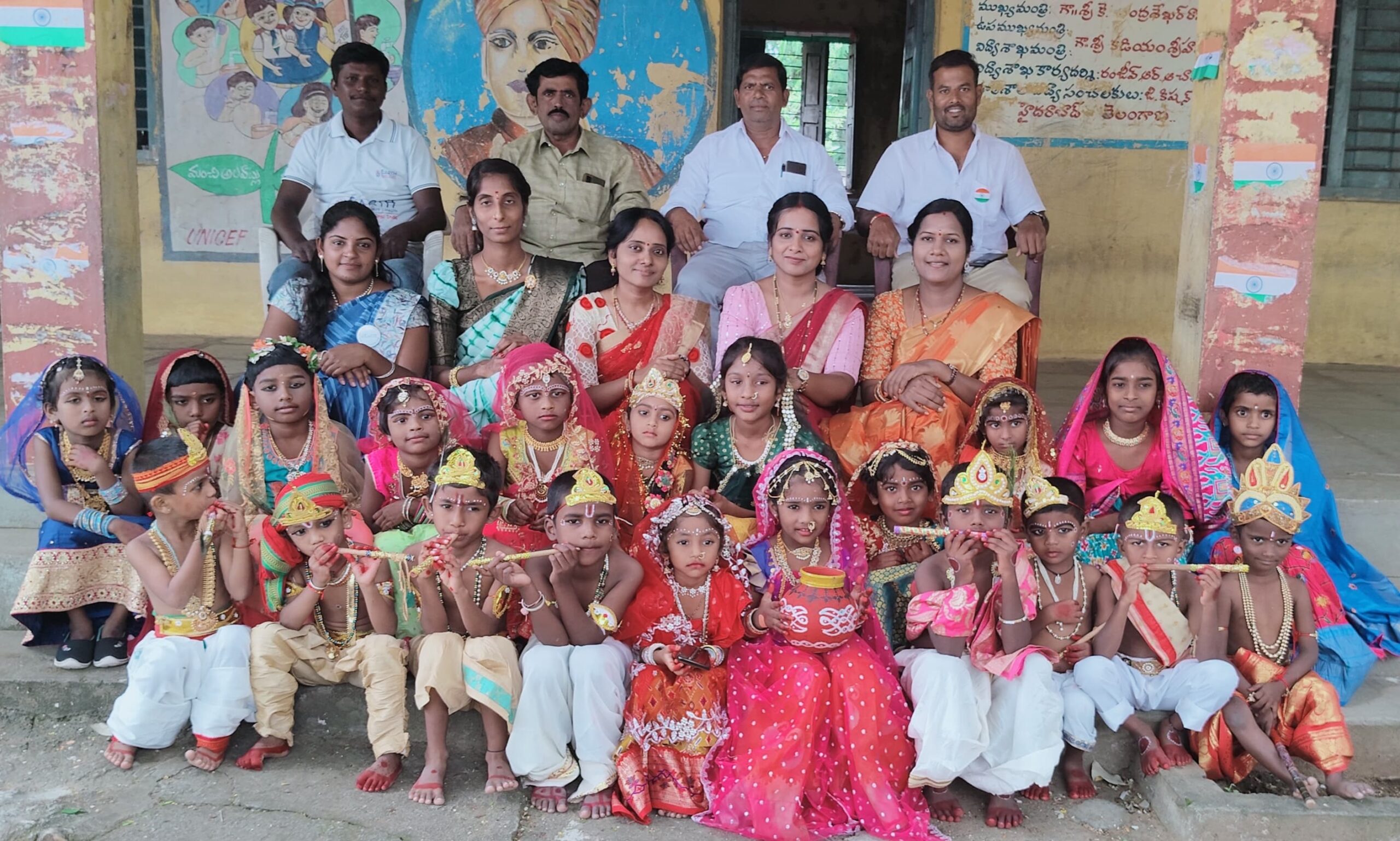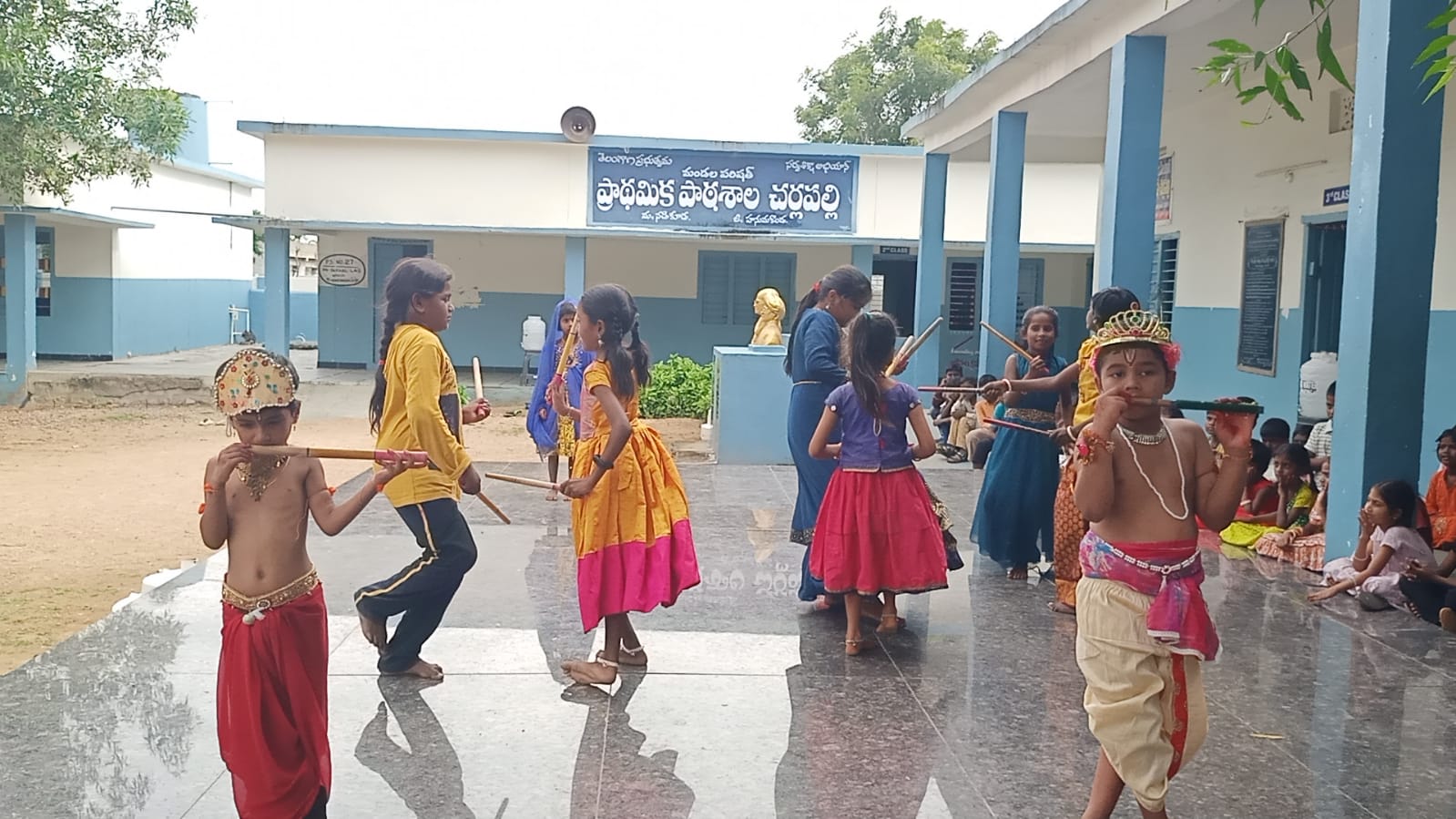 Krishna Janmashtami was celebrated with great enthusiasm in Bhoompally, Peddapuram, Cherlapalli, Thimmapur, Puligilla, and Kammarlapally. Students showcased their talents through vibrant dances, with girls adorning themselves as Gopikas and boys dressed as Lord Krishna, complete with flutes. Teachers added to the festive atmosphere by drawing Krishna’s footprints on the floor, symbolizing his divine presence.