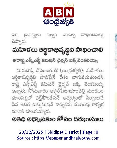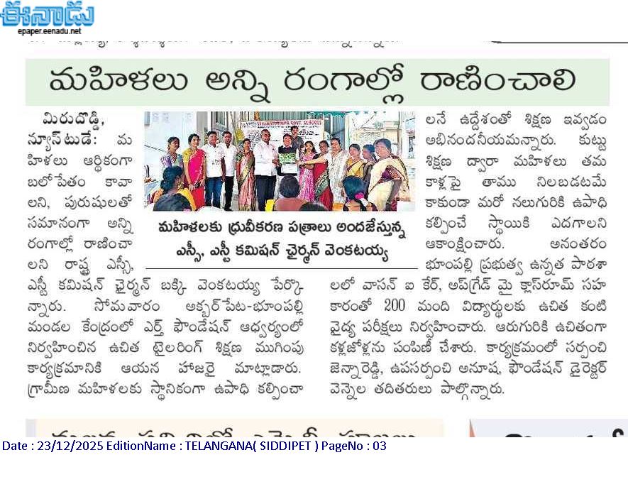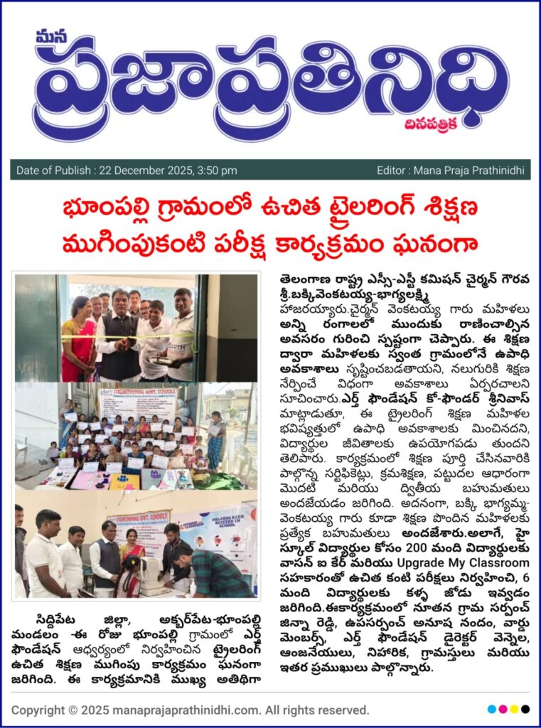 As part of its commitment to women empowerment and community development, the EArtH Foundation organized a Free Tailoring Training Program for women in Bhoompally Village, Akbarpet–Bhoompally Mandal, Siddipet District, followed by a well-attended closing ceremony with guests, community leaders, and Foundation team members. The program focused on equipping rural women with practical tailoring skills to support self-employment within their own village. Bakki Venkatayya highlighted the importance of women progressing in all fields and encouraged trainees to share their skills with others to create local livelihood opportunities. Kalaveni Srinivas appreciated the dedication shown by the participants and emphasized the program’s positive impact on families and students. Women received free training from basic to advanced stitching, learning to stitch blouses, designer blouses, and frocks, and all trainees were awarded certificates, with first and second prizes recognizing discipline and performance. Smt. Bakki Bhagyalakshmi, along with Sri Bakki Venkatayya, also presented special gifts to all trainees as encouragement and appreciation. The mothers shared heartfelt testimonials, expressing confidence in stitching, earning from home, and gaining independence through hands-on learning. The event received positive local media coverage, including Eenadu, and strong community appreciation—reaffirming the Foundation’s mission to build self-reliant women, stronger families, and resilient villages.