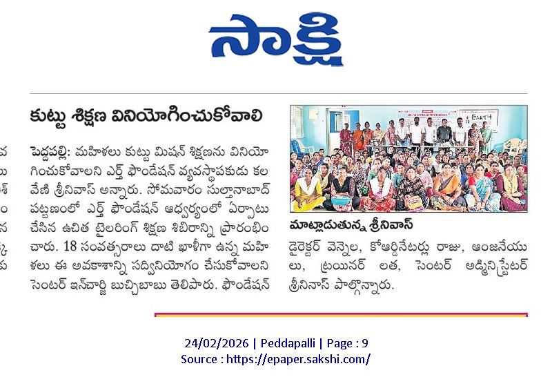EArtH Foundation has been actively working toward rural development by strengthening education, skill development, employment opportunities, and social awareness among youth and women through the EF Training & Research Centre at Sultanabad. An awareness program for newly elected Sarpanches was conducted at Mother Theresa Engineering College, Peddapalli, encouraging village leadership to support skill-based initiatives and identify eligible beneficiaries. Community outreach activities were carried out through pamphlet distribution during Sammakka Jathara at Narayanpur and Thogarrai villages, while Citi Cable TV advertisements across six mandals increased public awareness and participation. The centre offers programs such as 1 Rupee tailoring training, defence and police coaching, study hall facilities, computer education, spoken English, science lab support, sports training, and yoga activities to promote holistic development, conducted through three daily batches with 35 participants in each batch to ensure effective learning. A Free Tailoring Training Program was inaugurated under the guidance of Founder Mr. Kalaveni Srinivas, with participation from 103 women and implementation support from the EArtH Foundation team and distinguished Head Masters. The program received media coverage in Sakshi, ABN, and Janam Sakshi newspapers, highlighting women’s empowerment and rural employment opportunities. Community response was highly positive, with increased participation, improved confidence among youth and women, and better access to learning resources. Overall, these initiatives demonstrate EArtH Foundation’s commitment to building self-reliant villages through education, skills, and sustainable community development.