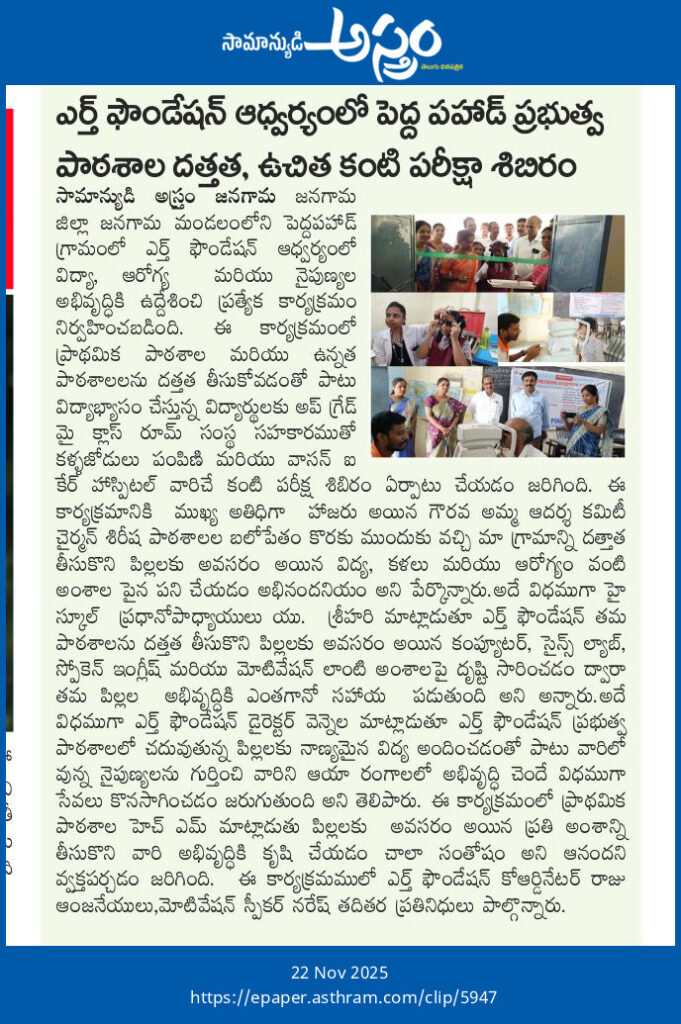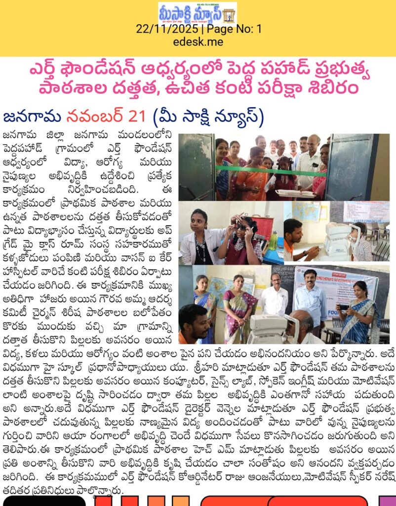 EArtH Foundation organized a Free Eye Check-up Camp at Peddapahad, coinciding with the adoption of both the Government Primary and High Schools in the village, to ensure students have clear vision for better learning. The camp, supported by Vasan Eye Care Hospital and Upgrade My Classroom, screened every student for eyesight issues and provided free spectacles to 13 children in need, immediately improving their ability to read, write, and participate in class. The program was coordinated by Director Vennela, Coordinator Raju Anjaneyulu, and Motivation Speaker Naresh, with active involvement from school staff, local community members, and special guest AAPC Chairperson Shireesha. The initiative highlighted the importance of combining health, education, and skill development for holistic growth. Teachers and parents appreciated the support, noting that students who struggled unknowingly with vision issues could now learn confidently. The event also received wide coverage in local newspapers, inspiring other schools to consider similar health initiatives. This one-day camp demonstrated how small efforts can create a lasting impact on children’s education, confidence, and overall development.
