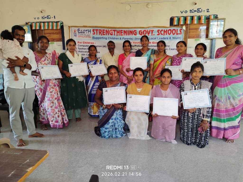 EArtH Foundation organized a Free Tailoring Training Program in Kasulabad village to support women’s empowerment and strengthen family welfare through skill development. The program was conducted for mothers of government school students, providing practical tailoring skills to help them generate income and become self-reliant. The closing ceremony was held in the presence of Chief Guest Praveen Babu (MEO), Sarpanch Babai Madam, Vice Sarpanch Raju, Active Person Komurayya, VOS parents, and community members. A total of 11 women successfully completed the training and received certificates in recognition of their achievement. Guests appreciated the initiative and encouraged participants to use their skills for self-employment and community development. The training improved participants’ confidence and created opportunities for financial independence while supporting children’s education. The program received a positive response from villagers, who expressed gratitude for the opportunity provided by the EArtH Foundation. The initiative stands as a meaningful step toward sustainable rural development and women’s empowerment in Kasulabad village.