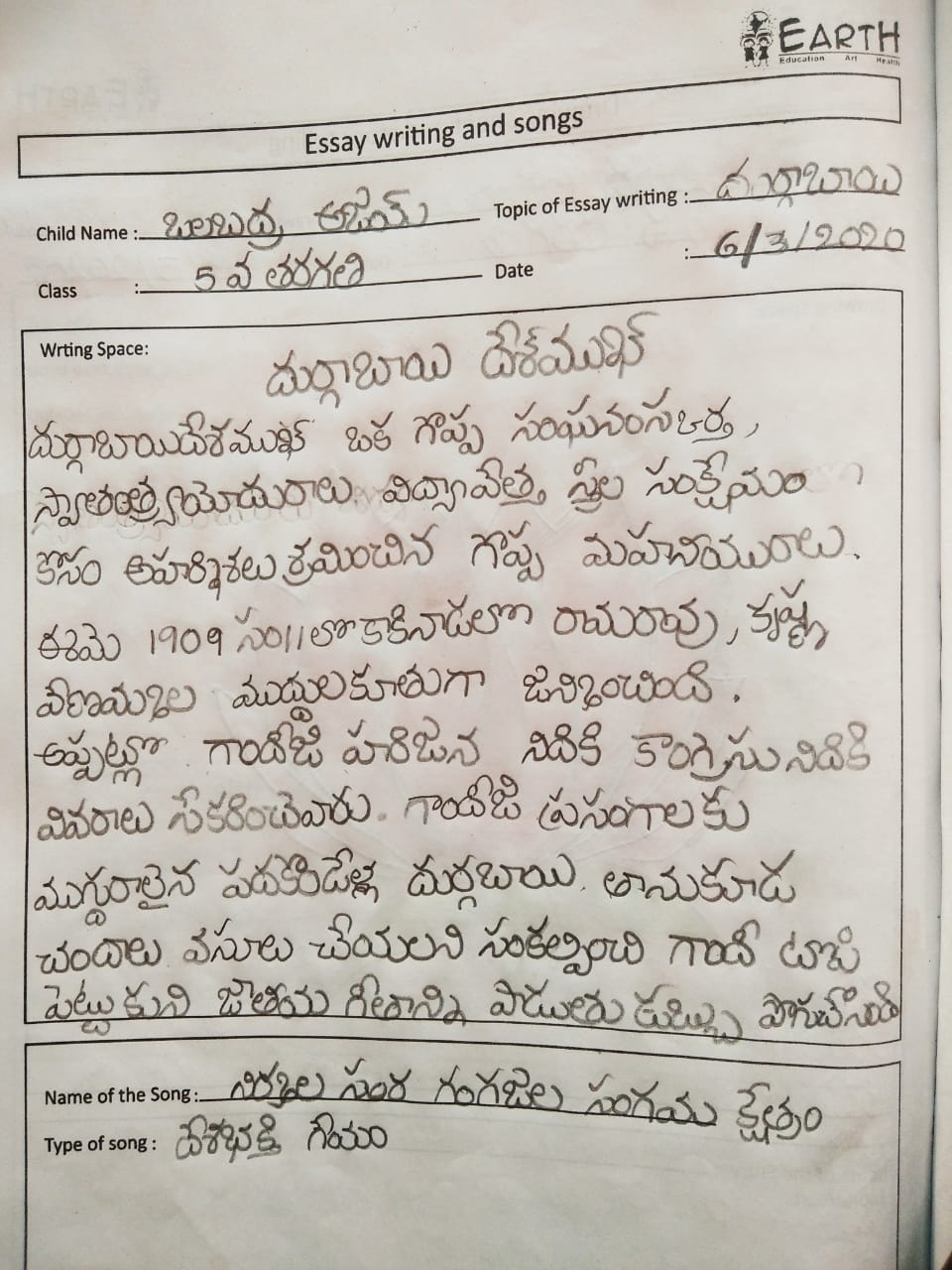 An essential component of EArtH’s curriculum is instilling patriotic values in children from an early age. To raise knowledge of India’s history and the freedom warriors, the team plans events, leads writing and reading workshops, and teaches as part of the curriculum. Students learn about the hundreds of years of selfless struggle for India’s independence during these classes. Students portray these principles through skits as well.